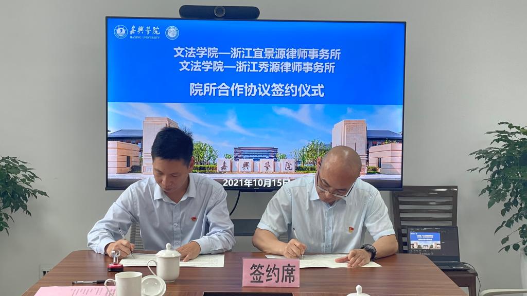 会议上,童建华和唐建伟、陈英代表双方分别签署了院所合作协议书。童建华为两家律所进行“嘉兴学院校外实践实训基地”授牌,随后颁发了兼职教师聘任证书。双方还围绕人才培养、课题合作研究、党建合作等方面内容开展座谈。